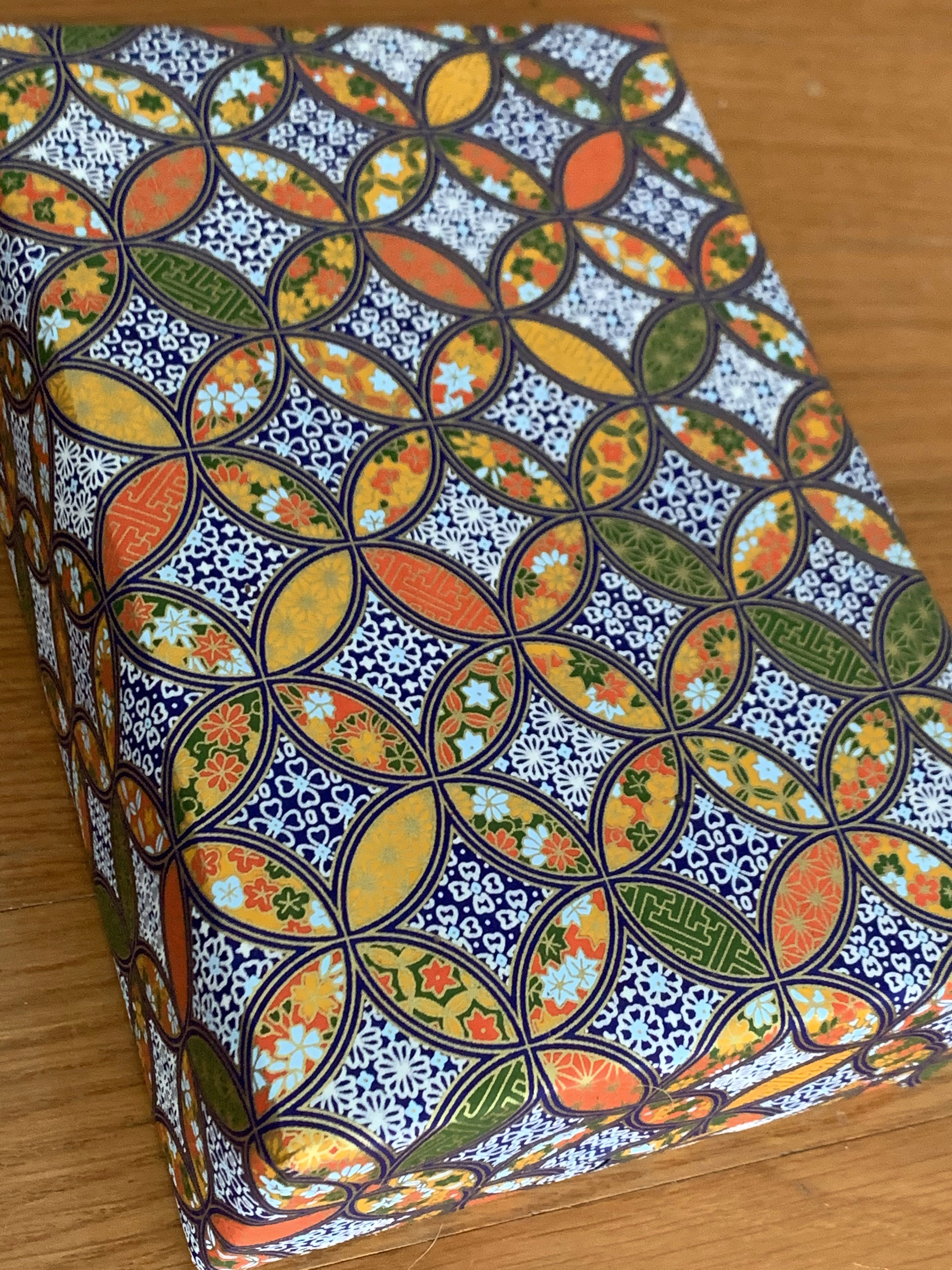 The first step is paper selection. Two specific recommendations: Paper Source which I tend to visit in person for very fine single sheets, and Society6 which has infinite variety but ships a little slow. I tend to keep brown paper on hand, especially for bulky items, and I also buy metalic/reflective paper from Walmart etc whenever is convenient.