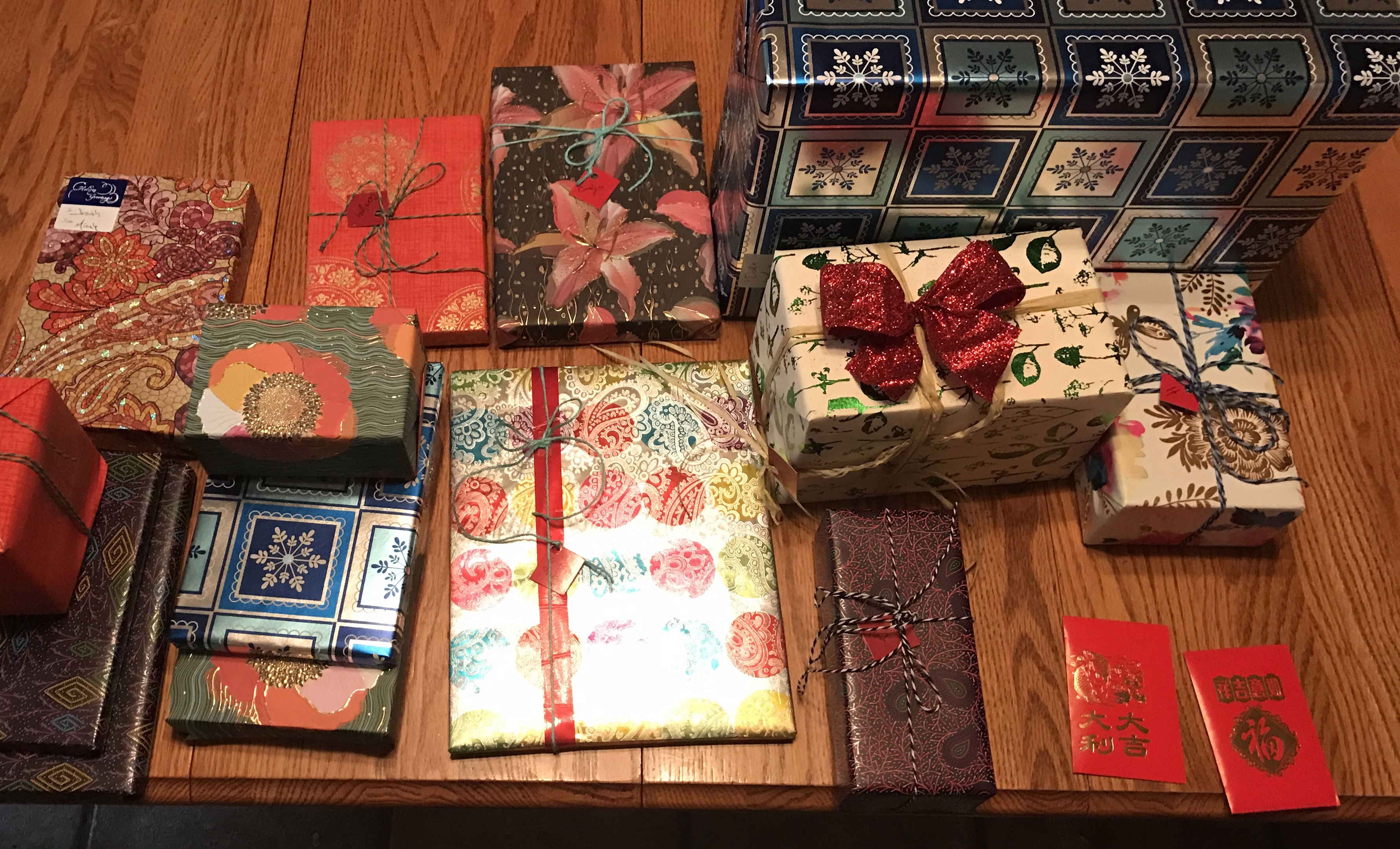 Sometimes I’ll add translucent cellophane, Washi tape, or patches of fabric or other wrapping paper after finishing a gift, especially if the paper is relatively plain. One member of my extended family has a signature style of brown paper decorated with ink stamps and tied with twine, which always looks so nice.
