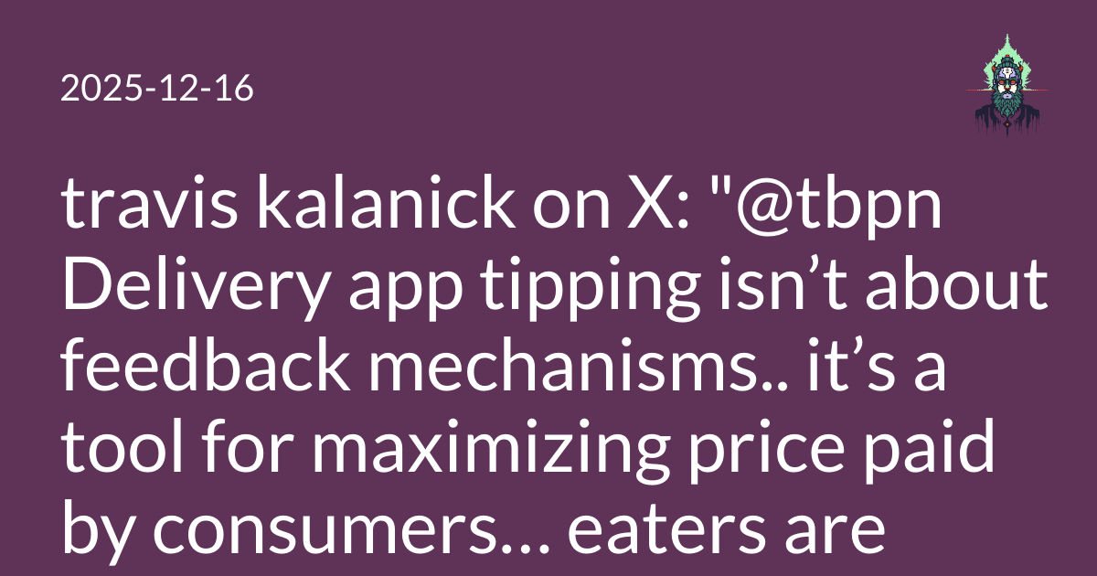 Delivery app tipping isn’t about feedback mechanisms.. it’s a tool for maximizing price paid by consumers… eaters are economically irrational with tip, for every $1 in tip, they economically behave as if it were $0.80 (directionally true but hypothetical figure) … this means less price elasticity for the same price… couriers are also economically irrational with tip, for every $1 in tip they economically behave as if it were $1.20 (directional) The tip is a hack on human psyche which the apps must implement and maximize or miss out on economic surplus that their competitor will use to defeat them. The app that decides to pay the same net amount to the courier but as a square deal vs a drop fee + tip will lose market share every day to an equal marketplace player that implements and maximizes tip